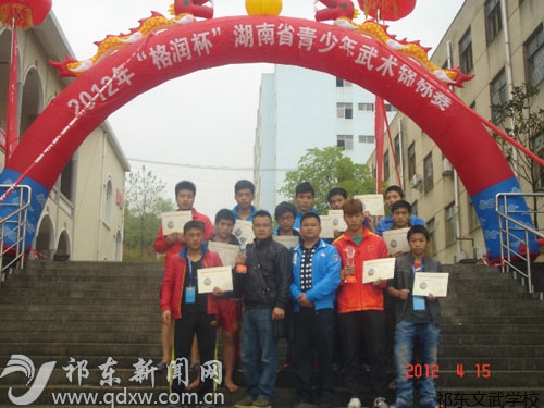 4月11日至16日,湖南省武术散打锦标赛在全国武术之乡东安县举行,来自全省各地、州、市1000多名运动员参加了此次体育盛会。祁东文武学校派岀11名运动员参加市州组、馆校组散打52、56、60、65、70以及70公斤以上六个级别的比赛,选手们凭着高超的武艺和擂台上的岀色发挥,共获得七枚金牌、两枚银牌、两枚铜牌和团体总分笫一的优异成绩,这也是祁东文武学校连续六年获得全省武术散打锦标赛团体冠军,为进军2014年湖南省第十二届运动会打下坚实的基础。