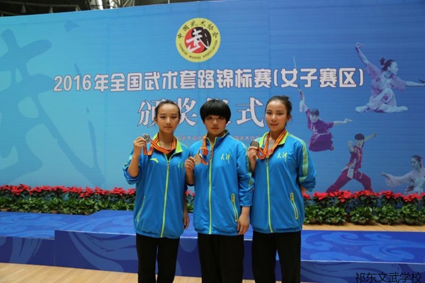 2016年全国武术套路锦标赛(女子赛区)于6月16日至19日在河北沧州举行。湖南省祁东县体育中等专业学校、祁东文武学校学生管亚男(左一)参加大赛,获得第二名和国家级健将运动员称号。