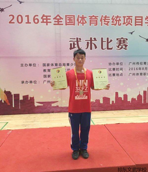 热烈祝贺本校学生张坚参加全国中学生武术比赛和全国体育传统项目学校武术比赛中荣获自选拳、棍两项冠军。