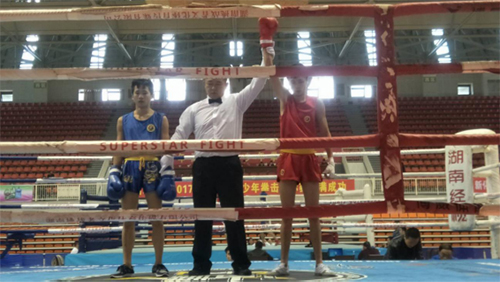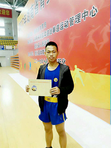为期五天的2017年湖南省青少年拳击锦标赛在娄底新化举行。我校19名选手参赛,经过几天的激烈角逐,学生王曾潜、伍锦涛、罗楚平、刘波、王涛分别获男子 48公斤级、54公斤级、60公斤级、70公斤级、56公斤级冠军。