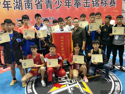 2017年,我们没有辜负全县人民的期待。我校武术代表队荣获三项省级冠军:(1)祁东文武学校代表祁东县教育系统参加在长沙举办的“弟子规国际功夫杯”湖南省第二届校园武术段位大赛,我校荣获第一名。(2)我校的武术散打代表队连续十年荣获湖南省青少年武术散打锦标赛团体总分第一名。(3)我校的拳击代表队连续三年荣获湖南省青少年拳击锦标赛团体总分第一名。