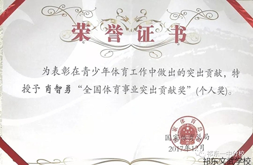 祁东文武学校由于武术竞赛成绩突出、对社会的贡献巨大连续三届十二年被评为“全国群众体育先进单位”,2017年,董事长肖智勇先生再次被评为“全国体育事业突出贡献奖”先进个人。