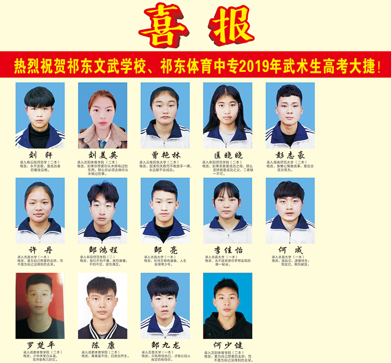 4月26日祁东文武学校参加武术高考的23名考生武术专业考试全部顺利通过,5月26日19名武术特长生被一、二本高等院校正式录取,其中一本(重本)上线9人,在湖南省独占鳌头,独领风骚。