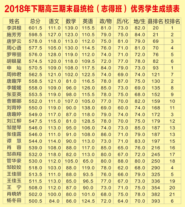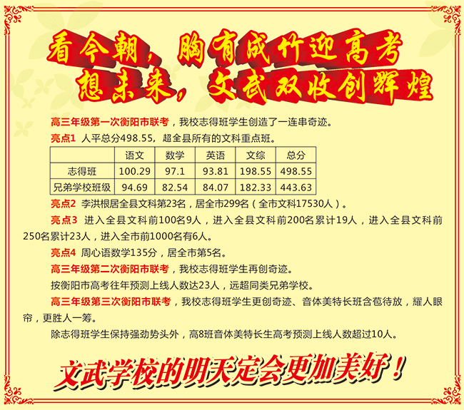 第一次联考,人平总分498.55,超全县所有的文科重点班;第二次联考,高考预测上线人数达23人,远超同类兄弟学校;第三次联考,音体美特长生预测上线人数超过10人。