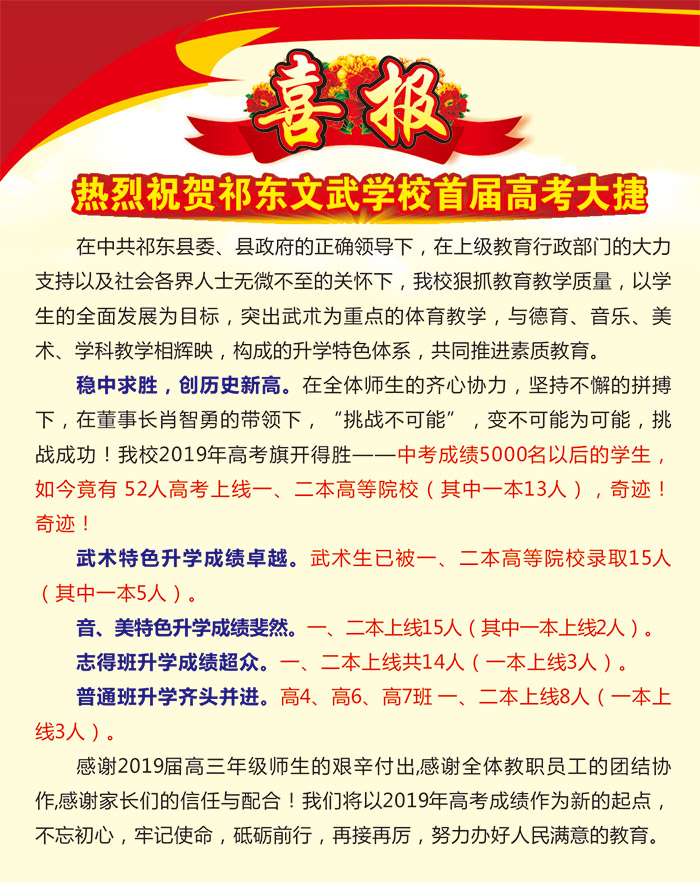 亲爱的同学:祝贺你成为祁东文武学校、祁东体育中专2019新生,我们全校师生热烈欢迎你的到来,为了让你尽快地适应新的学习、生活环境,现将新生入学有关事项告知于你。