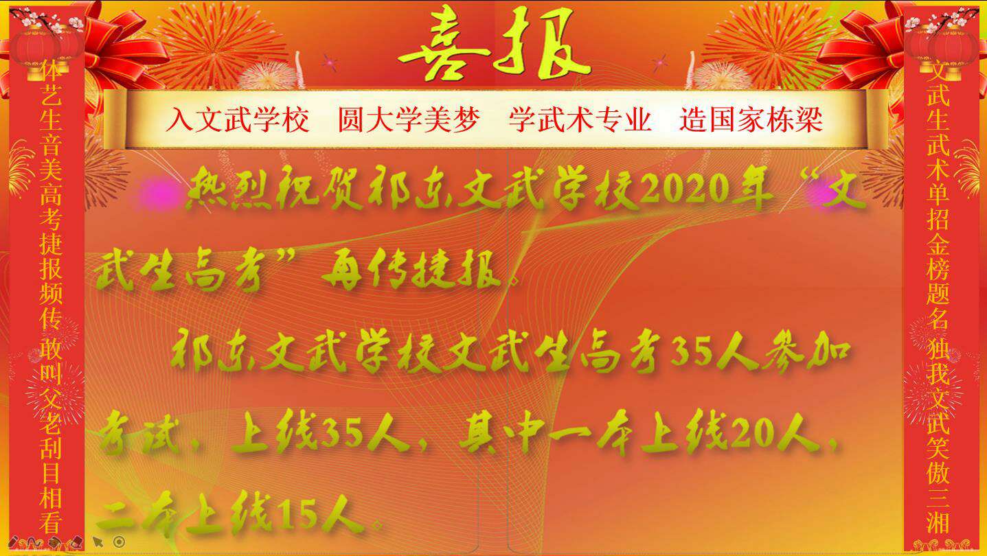 祁东文武学校2020年文武生武术高考惊艳亮相,35人参考20人上一本线,15 人上二本线,共计上线人数35人。